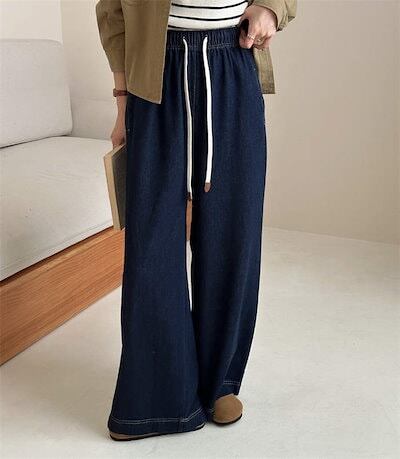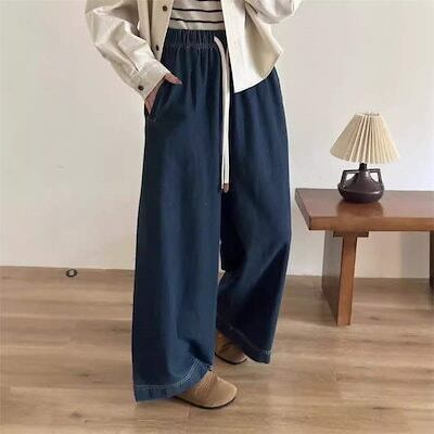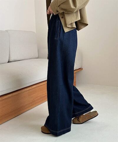 デニム パンツ レディース 秋 冬 オールシーズン ワイドパンツ ロング丈 ウエストゴム 無地 ジーンズ ボトムス ゆったり ストレートパンツ コットン 楽ちん デニムパンツ 体型カバー 大きいサイズ | KAGEYAMA-SECOND