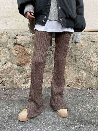 パンツ レディース ボトムス リブニット ケーブル編み フレアパンツ サイドスリット ケーブルニット ロングパンツ ニットパンツ ロング 秋冬 きれいめ ワイドパンツ ハイウェスト フレアニットパンツ | KAGEYAMA-SECOND