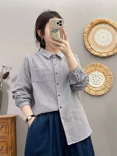 シャツ レディー 長袖 ダブルガーゼス チェック柄 綿 ブラウス 入学式 トップス オフィス 長袖 折り襟 春秋 おしゃれ ゆったり きれいめ カジュアル 体型カバー お呼ばれ 通勤 通学 卒業式 卒 | KAGEYAMA-SECOND