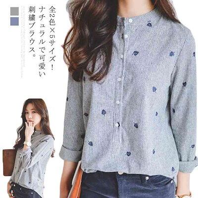 全2色×5サイズ!刺繍トップス シャツ レディース 長袖シャツ カジュアルシャツ ストライプシャツ ブラウス トップス スタンドカラー 立ち襟 カレッジ風 刺繍 かわいい シンプル ゆったり | KAGEYAMA-SECOND