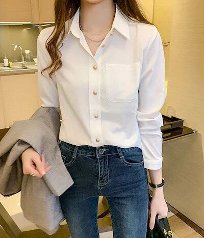 シフォン シャツ ブラウス レディース 長袖 スーツ インナー 白シャツ トップス フォーマル 無地 ホワイト 白 オフィス ビジネス 立ち襟 開襟 春秋 春 秋 お洒落 通勤 ワイシャツ カジュアル | KAGEYAMA-SECOND