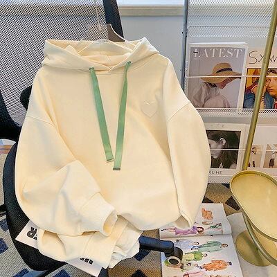 アンズ色 フード付き スウェット レディース 秋 フェイクレイヤード キュービック ハート ゆったり トップス