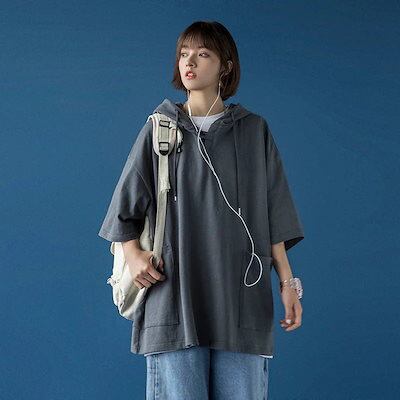 韓国ファッションレディース フード付きベスト無地ゆったり半袖パーカー トレーナー Tシャツ スウェット 男女兼用 トップス プルオーバー オーバーサイズ