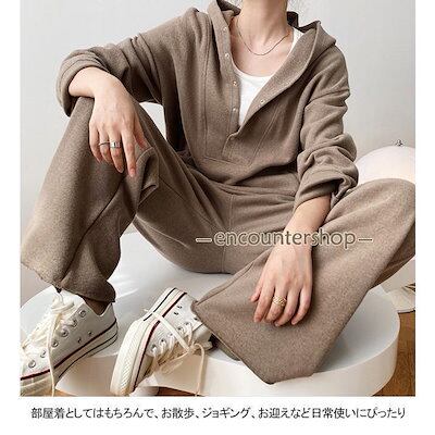 スウェット レディース パーカー 上下セット 無地 ハーフボタン ウエストゴム フード付き ポケット付き ゆったり シンプル 秋冬