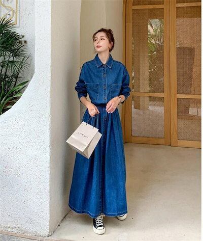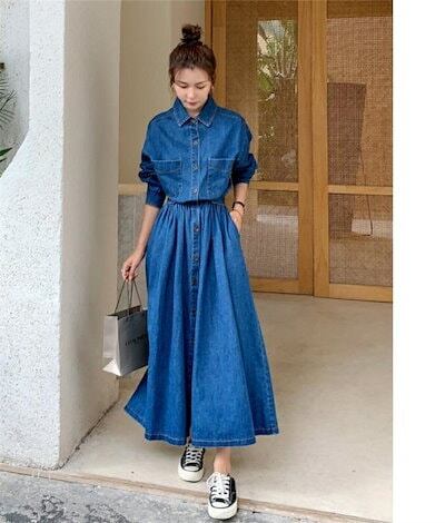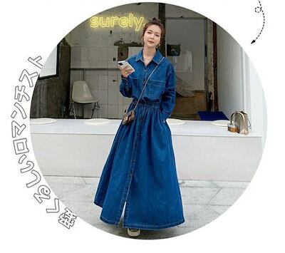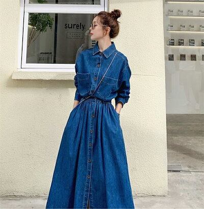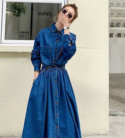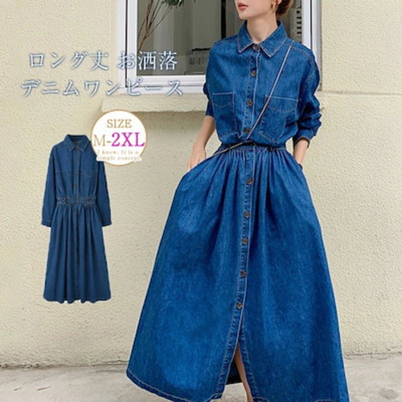 シャツワンピース デニム 秋 長袖 レディース デニムワンピース ロングシャツワンピース ワンピ 大きいサイズ マキシ丈 Aライン ロングワンピース ゆったり 体型カバー カジュアル キレイめ 着痩 | KAGEYAMA-SECOND