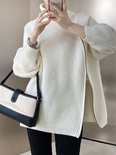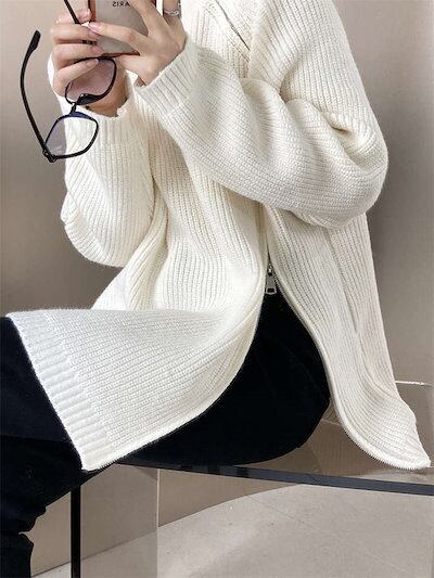 変形ジップアップニット ニット セーター レディース 秋冬 トップス 長袖 セーター リブニット リブ ハイネック ジップアップ アシンメトリー 変形 レイヤード 無地 モード系 個性的 大人 ビッグ | KAGEYAMA-SECOND