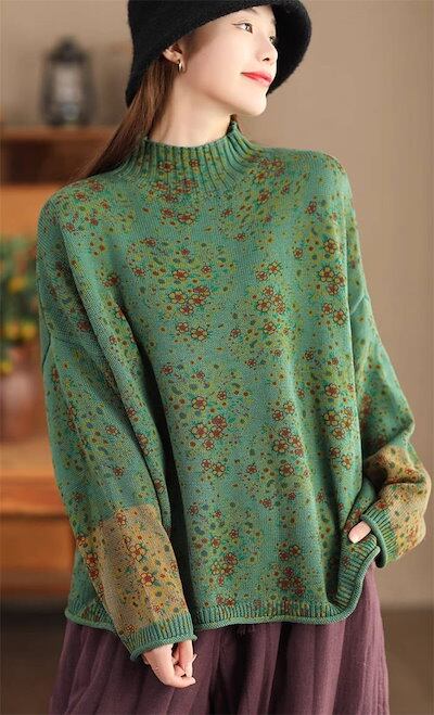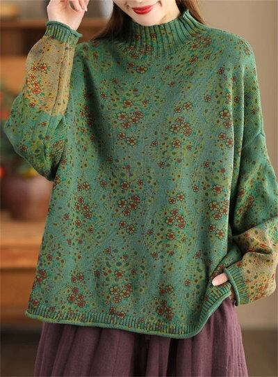 花総柄 ニットソー ハイネック コットン 長袖 レディース レディースニット 長袖セーター ニットセーター あったか カットソー プルオーバー 厚手 総柄ニットセーター 長袖ニット ストレッチ 森ガ | KAGEYAMA-SECOND