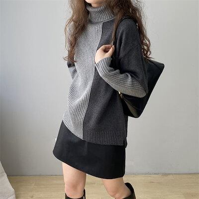 ニット セーター レディース 秋冬 長袖 セーター レディー ス 秋 冬 ニットセーター プルオーバー タートルネック 配色 切り替え アシンメトリー エレガント シンプル 無地 体型カバー 大きいサ | KAGEYAMA-SECOND