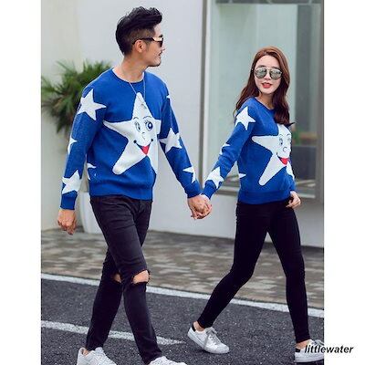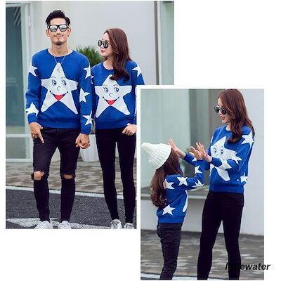 『目玉新商品』親子ペアルック セーター ニット 長袖 レディース メンズ クルーネック トップス おしゃれ お揃い 大人用 男性 女性 スター 星 ブルー カップル | KAGEYAMA-SECOND