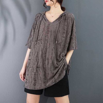 「ファットガール」 破れデザイン ダメージブラウス フード付き ロンT パーカー Vネック 夏 体型カバー 大きいサイズ ゆったり レディース