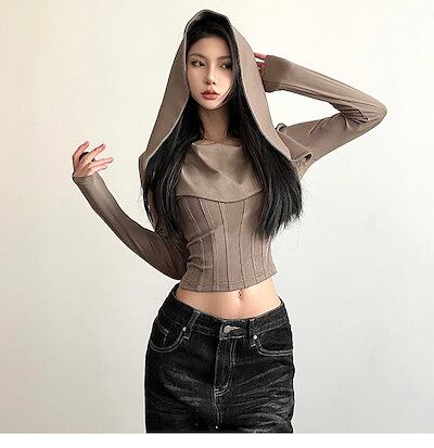 2024 春秋 フード付き tシャツ ファッション トップス 薄手 韓国系コーデ 重ね着風 長袖 切替 ソリッドカラー衣装シャツスリムトップパイル襟シャツ肌見せ女っぽフレンチタイト丈 レディース T安 | KAGEYAMA-SECOND