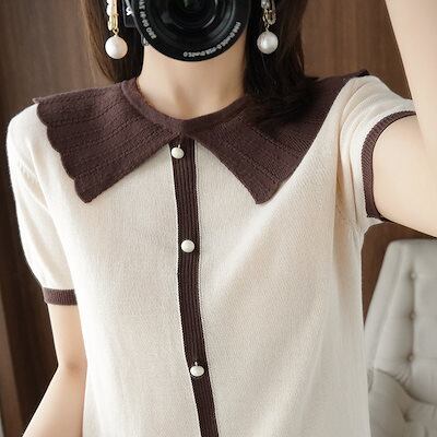 純綿2024夏レディース新作ショートルーズベビードールカラー半袖プルオーバーパールボタンセーターtシャツトップ