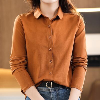2 シャツ 2024 春レディース新作ショートルーズポロカラー無地長袖ボタン付きボトムシャツ