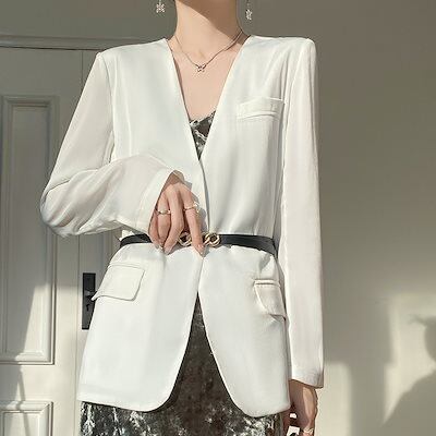サテンシルク 2024 春夏レディース新作スーツの襟ボタンなしソリッドカラーファッション気質スーツルーズトップジャケット