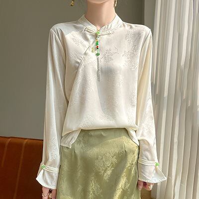 シルク シルク 24 夏 レディース 新作 サテン ニュースタンドカラー ボタン 長袖シャツ ショート ダーク柄 トップス