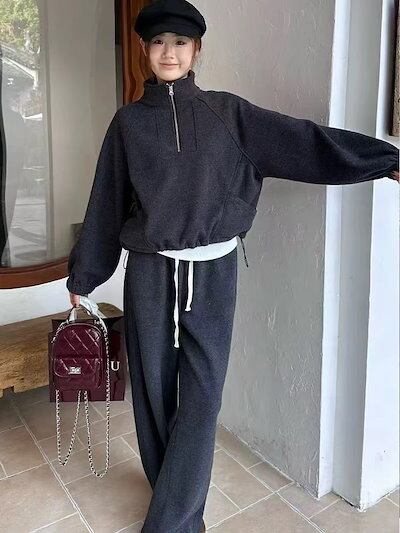 初春 二点セット スウェット パーカー運動 セットアップ トレーナー 韓国 かわいい レディース 無地長袖アウターレトロセット上下フーディーハーフサイズ丈トップス春カジュアルスポーツファッション系 | KAGEYAMA-SECOND