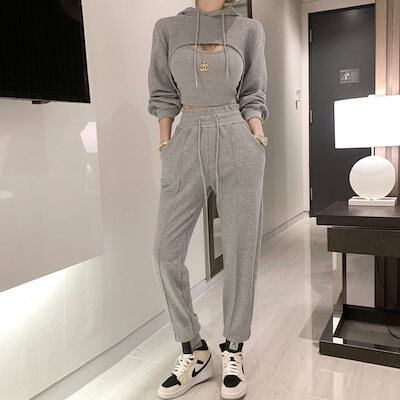 初春 3点セット スウェット パーカー セットアップ トレーナー 運動 韓国 かわいい レディース 無地長袖アウターレトロセット上下フーディーハーフサイズ丈トップス春カジュアルスポーツファッション系 | KAGEYAMA-SECOND