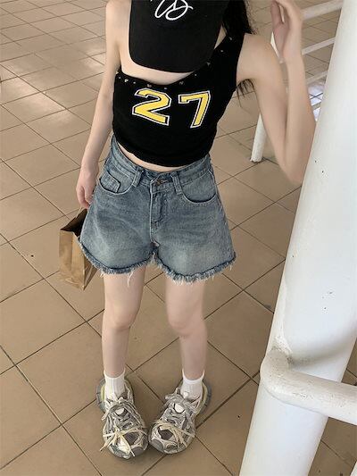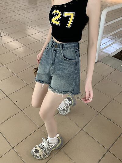 2024 春夏パンツ デニム ジーンズ ショート丈 フリンジ ハイウエスト 美脚効果 脚長効果 細見え 夏 おしゃれ かわいい 韓国ファッション レディース お出かけ | KAGEYAMA-SECOND