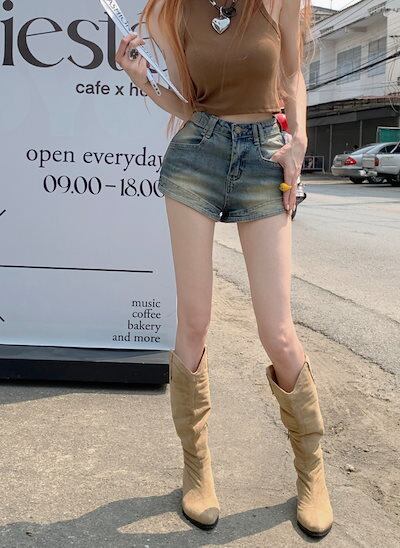 2024 春夏パンツ ショート丈 デニム ジーンズ スリム スキニー ウォッシュ加工 ハイウエスト 美脚効果 脚長効果 細見え 夏 おしゃれ かわいい 韓国ファッション レディース お出かけ | KAGEYAMA-SECOND