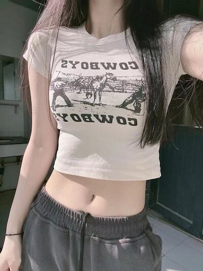 2024 夏 韓国 甘い トップス Tシャツ ラウンドネック丈 休日 フレンチ 韓国 ブラウス ファッション タイト スリムフィット丈短め ショート レディース へそ出し 休日 おしゃれ T | KAGEYAMA-SECOND