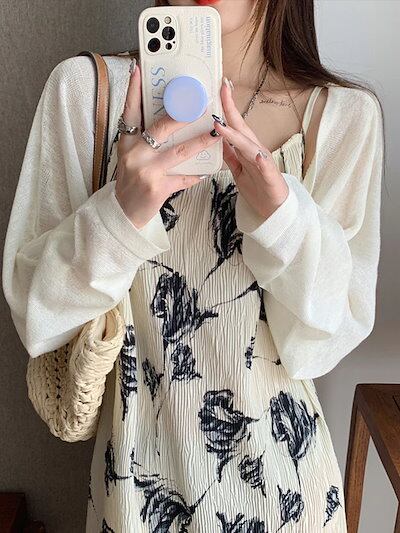 2024 春夏 ショート丈 薄手 カーディガン トップス 長袖 紫外線対策 UVカット冷房羽織り加工 きれいめ ライトニット オフィス OLネックカジュアルフレンチフェミニンファッション韓国レディース | KAGEYAMA-SECOND