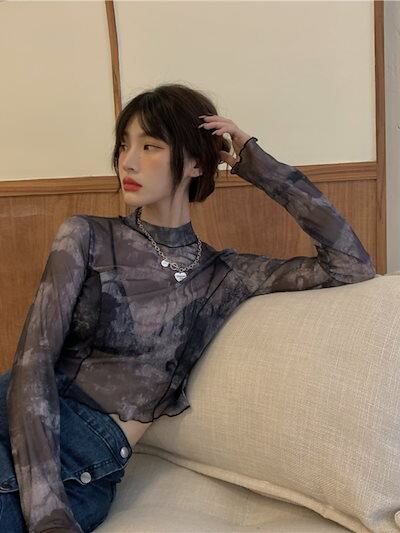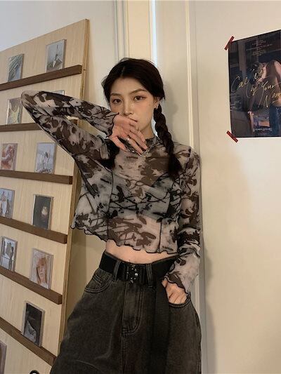 2024 春夏 女度を格上げ tシャツ ファッション トップス 薄手 韓国系 長袖 薄手フィット プリント レイヤード 重ね着 肌見せ 女っぽハイフレンチタイト丈 レディース T | KAGEYAMA-SECOND